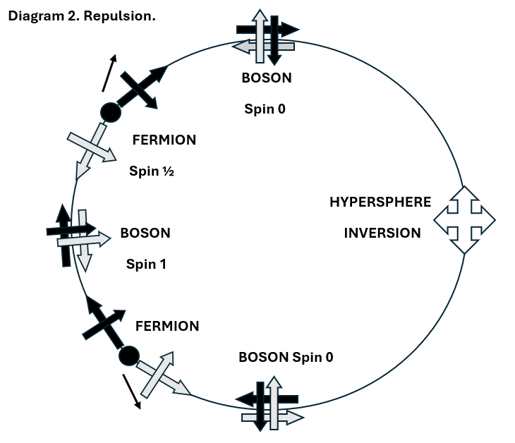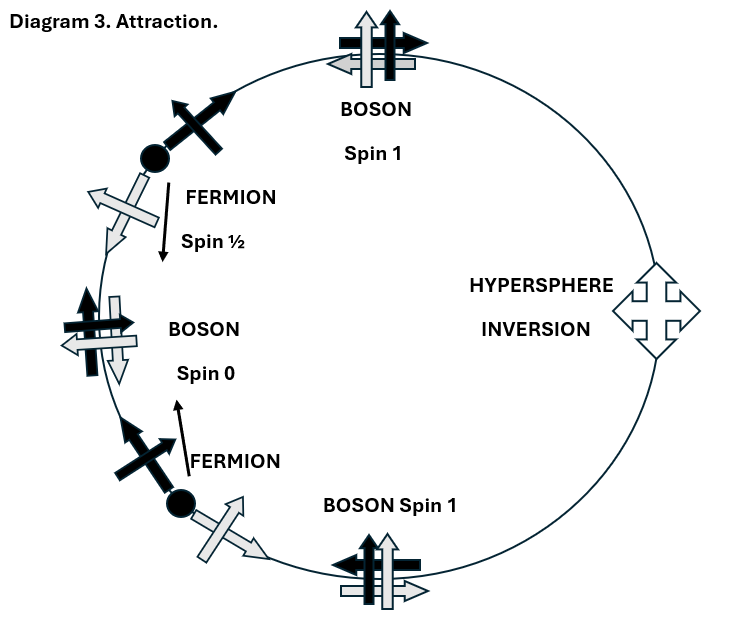 Diagram 3 shows how an attractive effect between fermions with some or all opposed spins can occur via the exchange of virtual bosons. Note that the attractive effect arises mainly from a repulsive effect that works right around the hypersphere. The transactional mechanism in which advanced waves travel back from the future ensures the instantaneity of the effect.