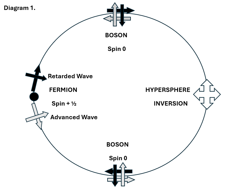 Diagram 1shows an idealised Fermion as the origin of spherical waves that propagate to the antipode of the hyperspherical universe and then reconverge back there as suggested here: -