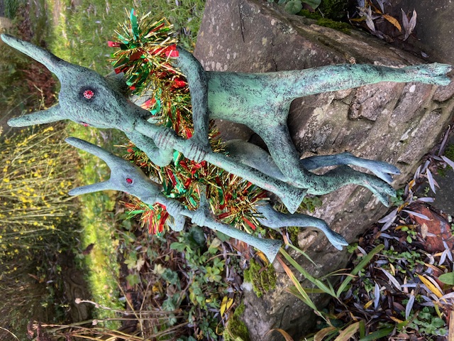 Seasonal Greetings! Herewith some additional Neo-Pagan Garden Statuary in festive garb. No, I’m not making a full orchestra of them, old friends have requested a version, they take about 100 hours each to make. Portland cement & finely sieved fibrous compost over steel wire frames, blackened with stone paint then verdigrised with acrylics for a weathered bronze effect.